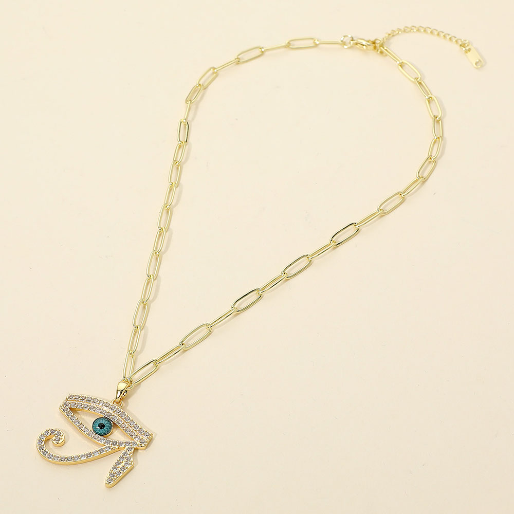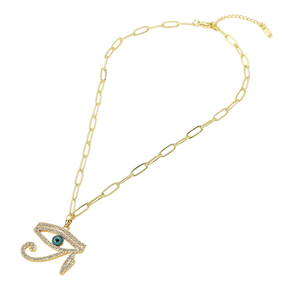 Details • Necklace Size : 16" + 2.25" L • Pendant Size : 1.25" X 1.3" • Symbolic Eye of Horus charm necklace designed to represent protection, strength, and positive energy. This statement necklace blends timeless symbolism with a modern silhouette, making it ideal for everyday wear or meaningful gifting. A versatile piece for boutiques seeking trend-forward jewelry with spiritual appeal and strong customer interest. • CZ Cubic Zirconia • Stainless Steel