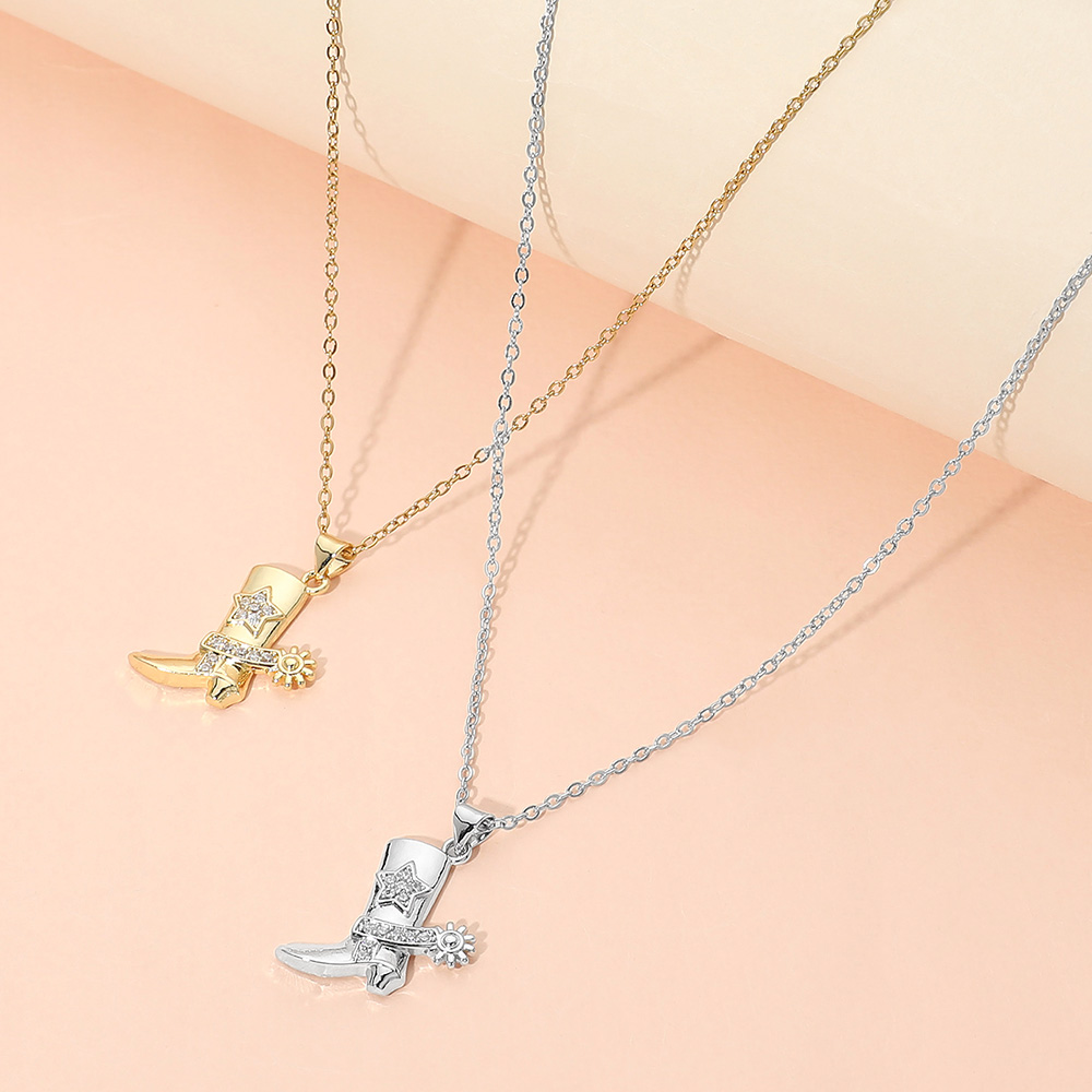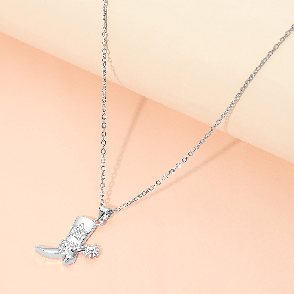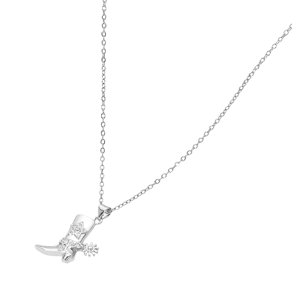 • This cowboy boot charm pendant necklace features a playful western-inspired design accented with sparkling details for added character. A stylish statement piece that symbolizes adventure and individuality, it is perfect for everyday wear, gifting, or adding a trendy western touch to boutique jewelry collections.