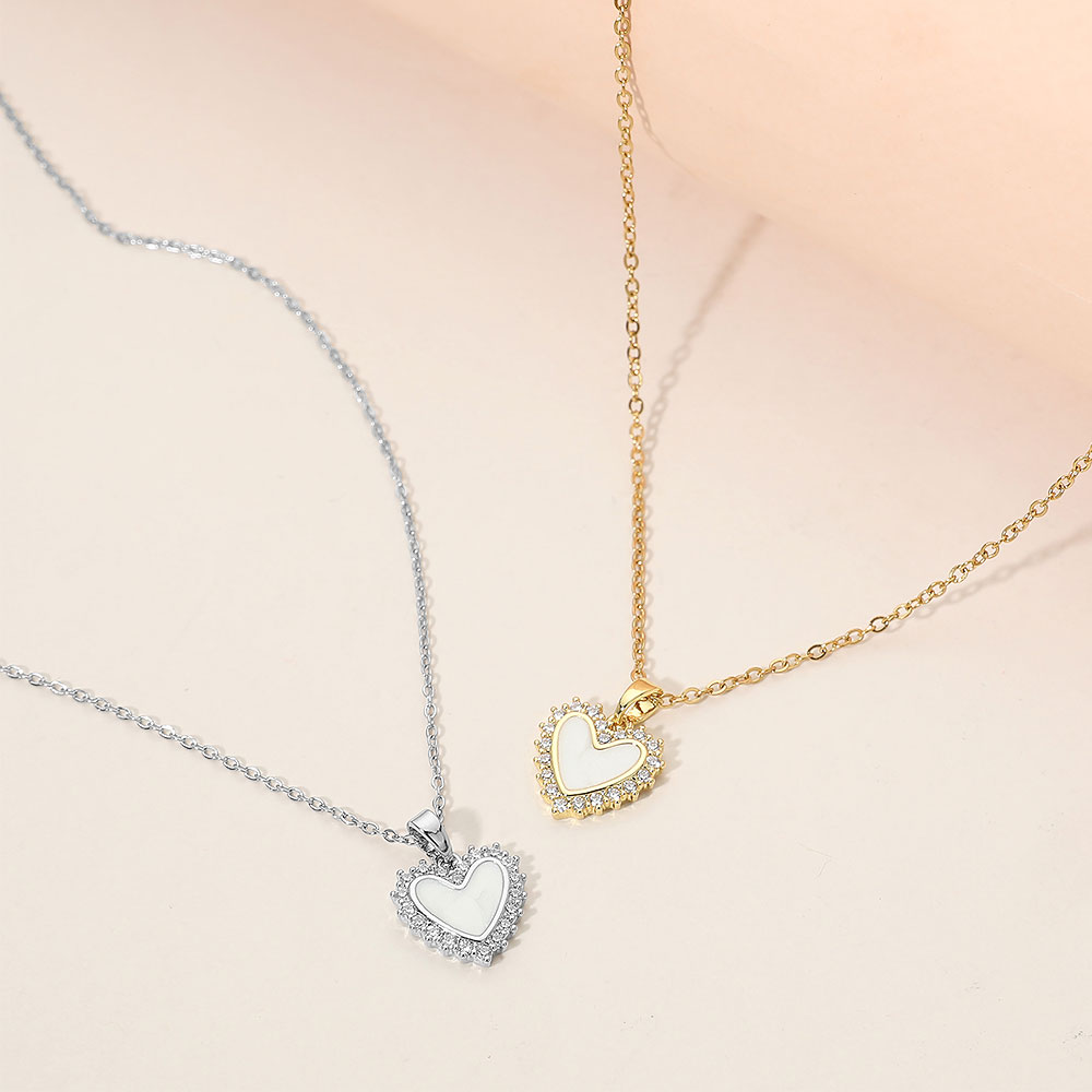 • Elegant mother of pearl heart charm pendant necklace featuring a refined cz pave-style border and smooth center detail. Designed for everyday wear or special occasions, this timeless necklace adds a romantic, polished touch to layered looks or standalone styling, making it an ideal choice for gift shops, boutiques, and trend-focused accessory collections.