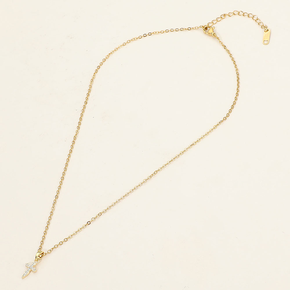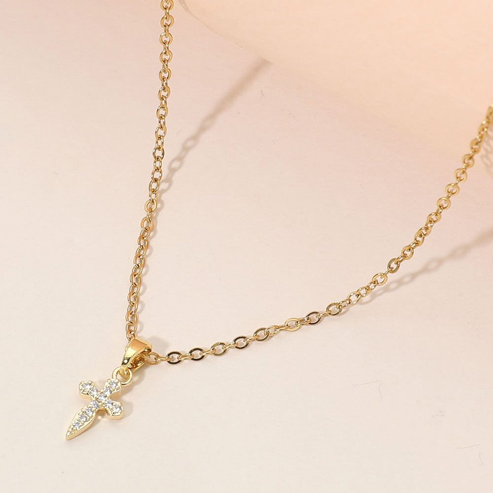 Details • Necklace Size : 15.5" + 2" L • Pendant Size : 0.25" X 0.7" • Delicate mini cross pendant necklace designed with a refined cz pave-inspired look for subtle sparkle and everyday elegance. Ideal for layering or wearing alone, this timeless necklace appeals to customers seeking meaningful jewelry with a modern, minimal feel, making it a versatile addition to boutique, gift, and faith-inspired accessory collections. • CZ Cubic Zirconia • Stainless Steel