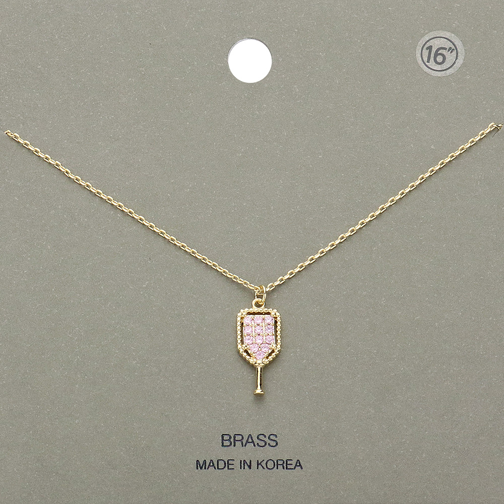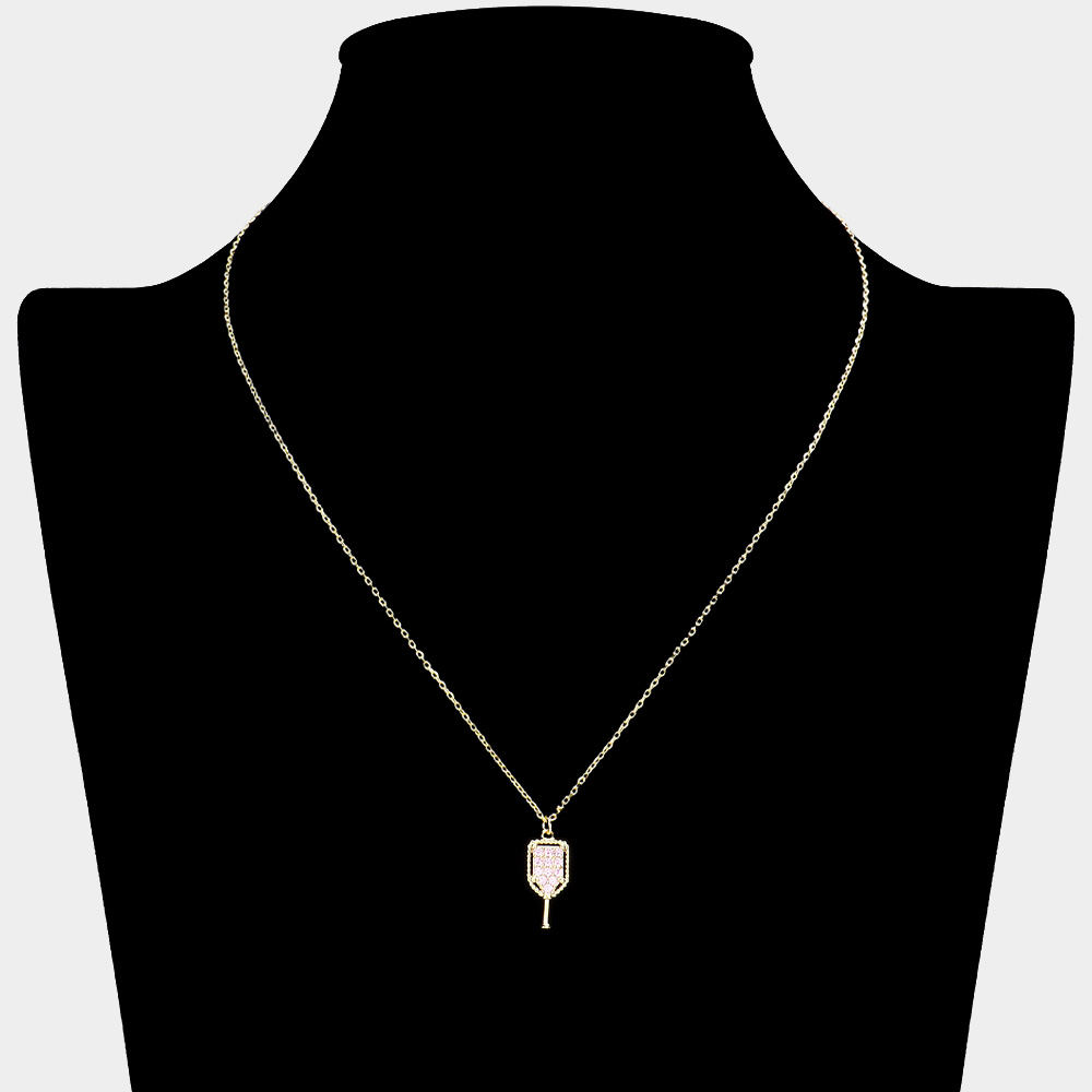 Stone Paved Brass Metal Pickleball Paddle Pendant Necklace