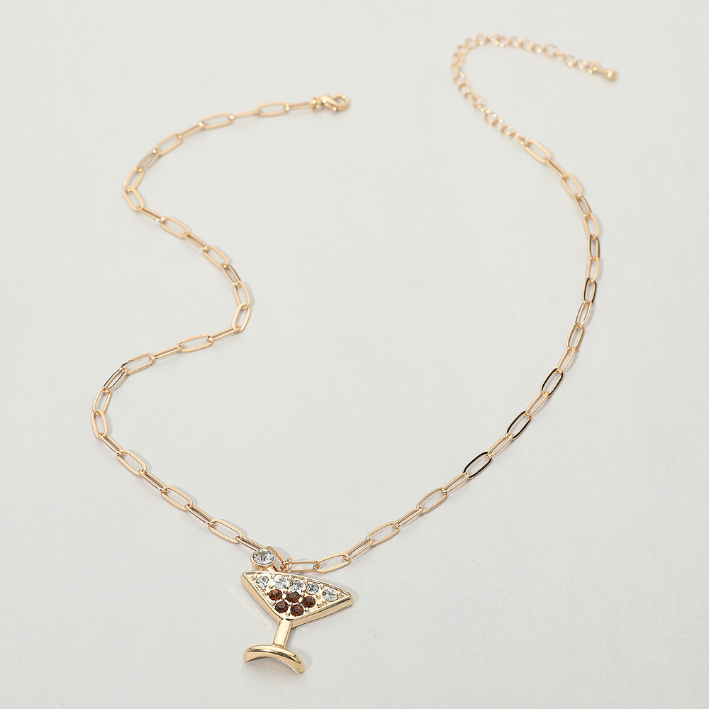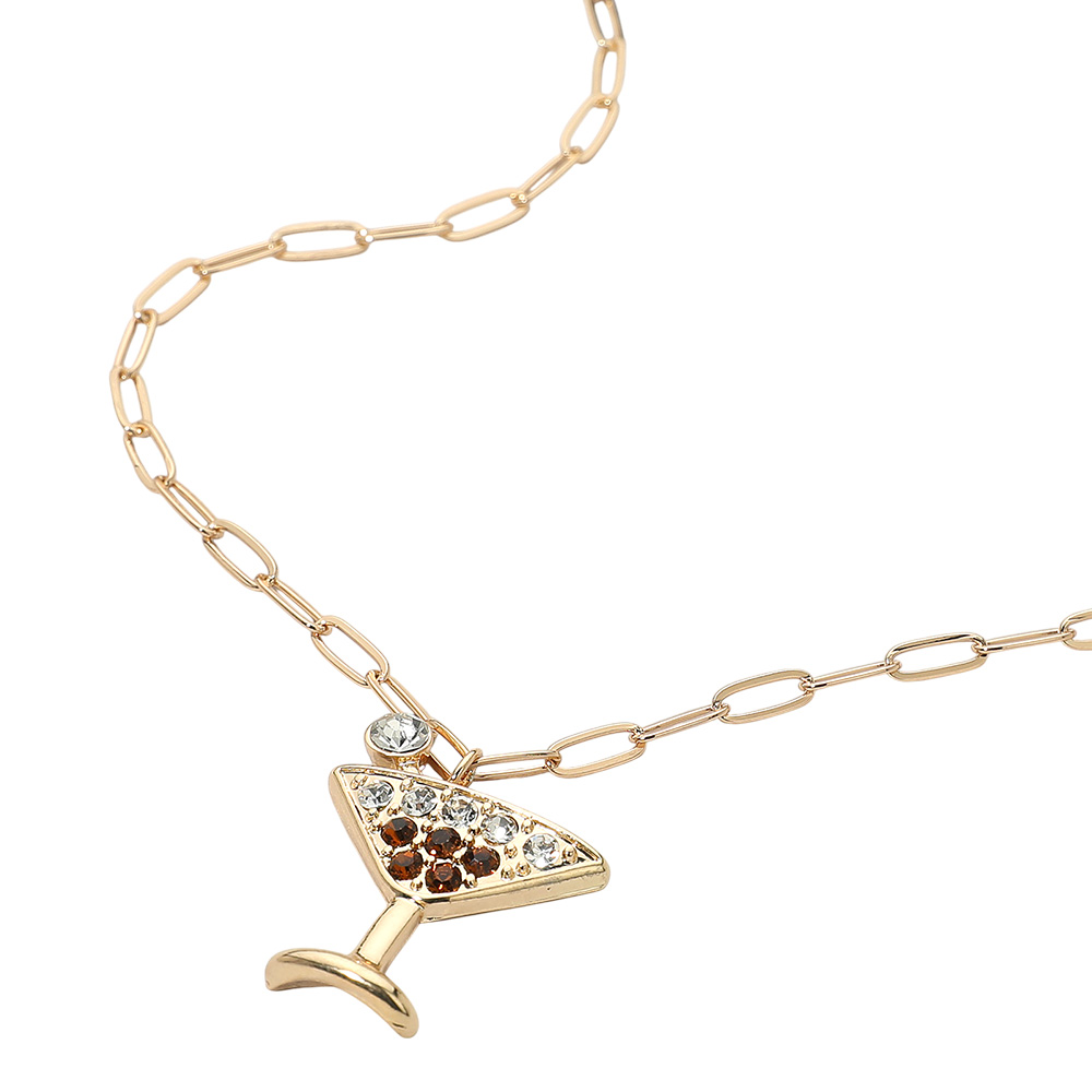 Details • Necklace Size : 16" + 3.5" L • Pendant Size : 1" X 1.25" • Add a touch of sparkle to your look with this crystal martini glass pendant necklace. Featuring shimmering stones and a chic chain design, it’s the perfect playful accessory for nights out, celebrations, or gifting to someone who loves fun, fashion, and a hint of glam. • Lead and Nickel Compliant