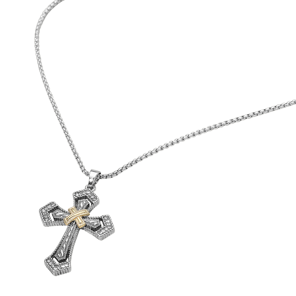 Details • Necklace Size : 17.75" + 3" L • Pendant Size : 1.2" X 1.9" • A bold cross pendant featuring intricate detailing paired with a sleek chain for a refined statement look. Perfect for everyday wear or heartfelt gifting, offering timeless appeal that layers beautifully or stands out worn alone. • Lead and Nickel Compliant