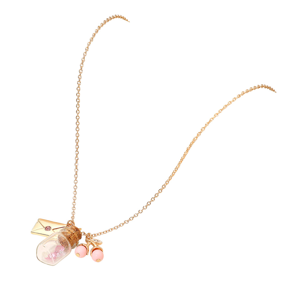 Details • Necklace Size : 17" + 3" L • Pendant Size : 0.5" X 0.9" • Whimsical charm necklace featuring a mini glass bottle, cherry pendant, and tiny envelope charm for a playful yet elegant look. Perfect for adding a cute and creative touch to everyday outfits, blending charm and sophistication in one delightful and eye-catching accessory. • Lead and Nickel Compliant