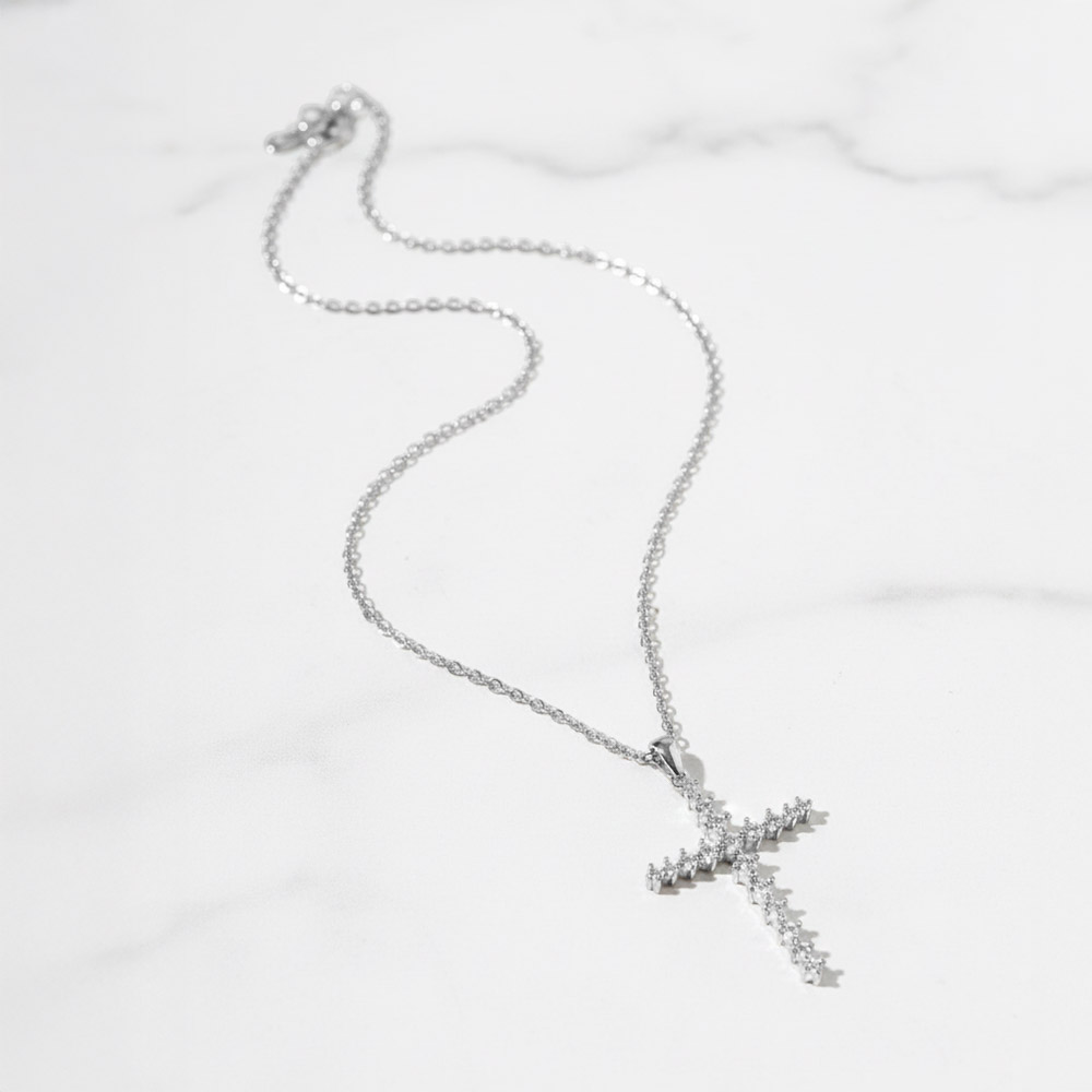 • This sparkling cross pendant necklace features a refined silhouette with shimmering stone accents that catch the light beautifully. Designed for everyday wear or special moments, it layers effortlessly or stands alone as a meaningful, elegant statement piece perfect for gifting and boutique collections.