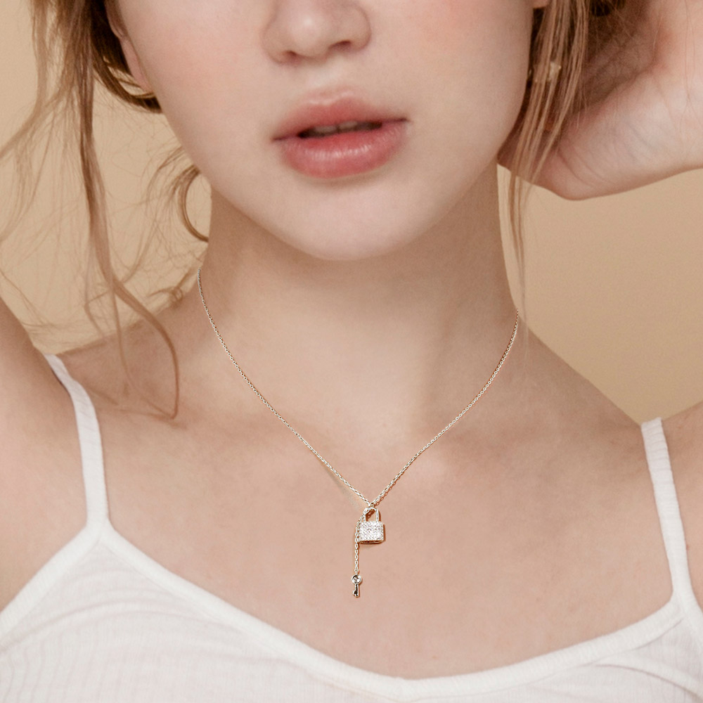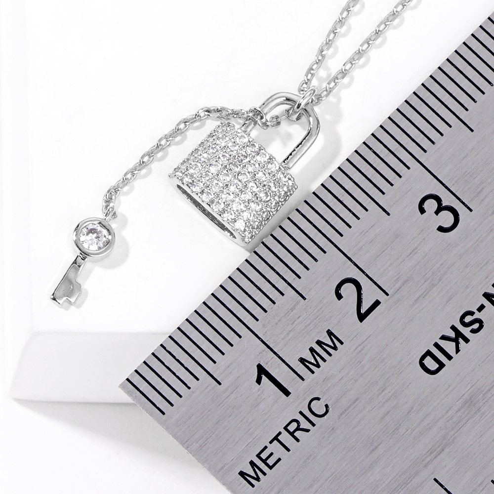 White Gold Dipped Rhinestone Key Lock Pendant Necklace