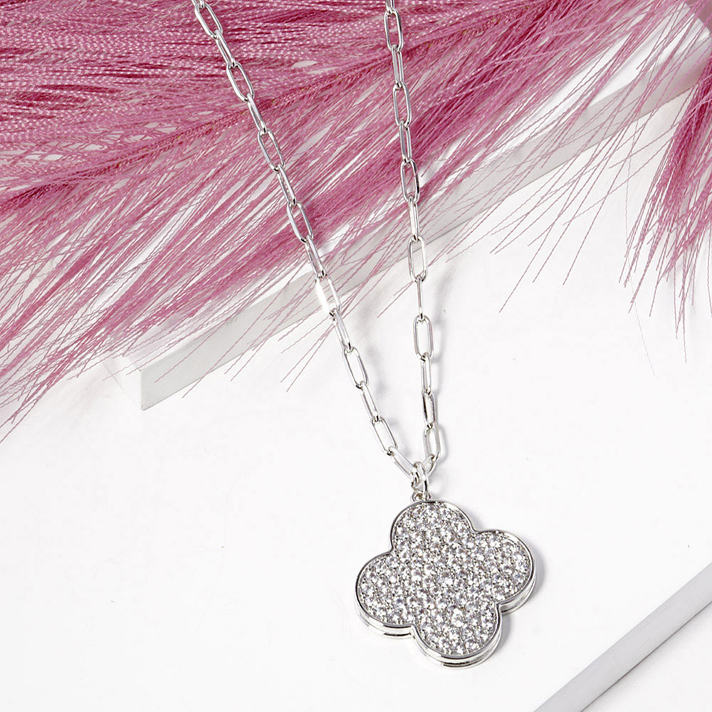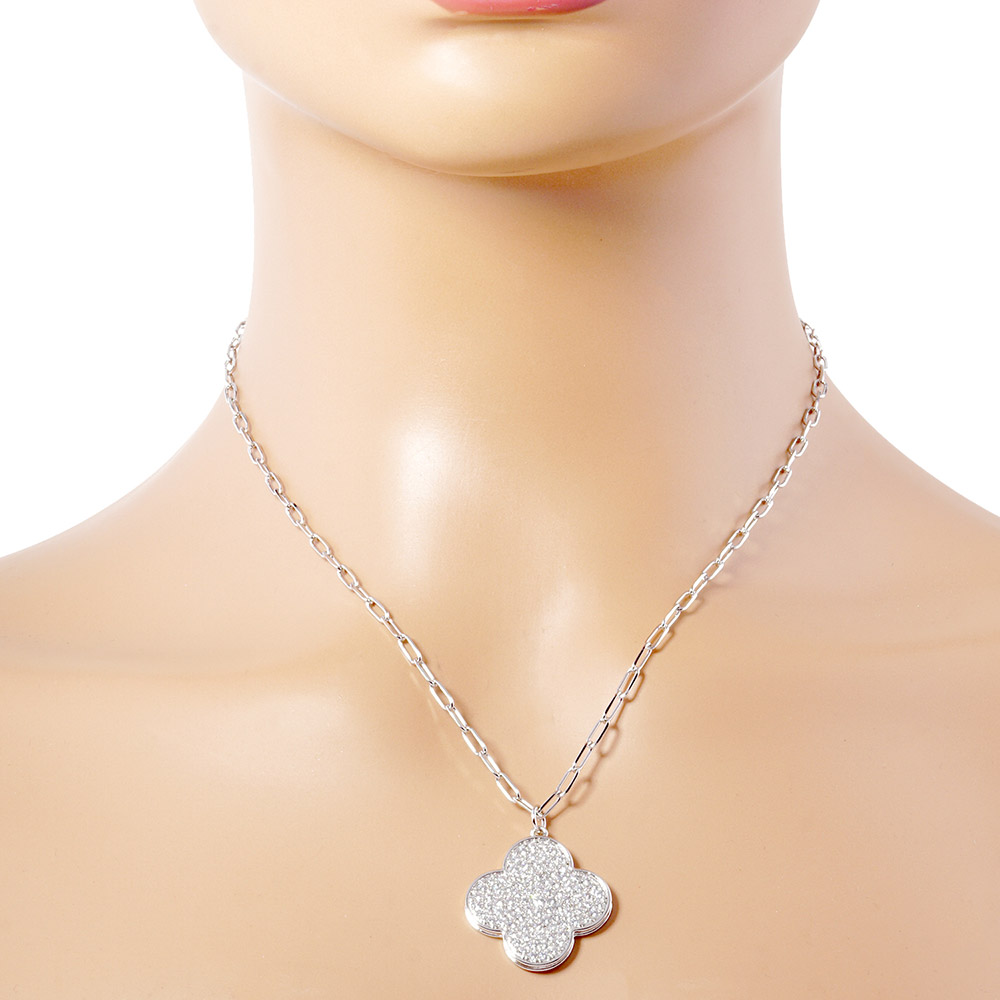 White Gold Dipped Stone Paved Quatrefoil Pendant Necklace