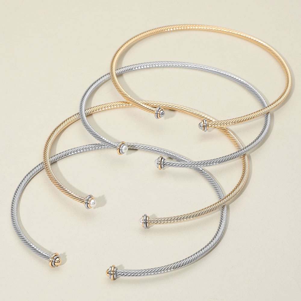 Details • Size : 15" L, 4.75" D • Decor Size : 0.4" L • Earrings Size : 0.1" L • Elegant twisted wire choker necklace set featuring a polished finish and pearl-accented end caps. Includes matching stud earrings. Perfect for adding modern flair to any outfit. • Lead and Nickel Compliant