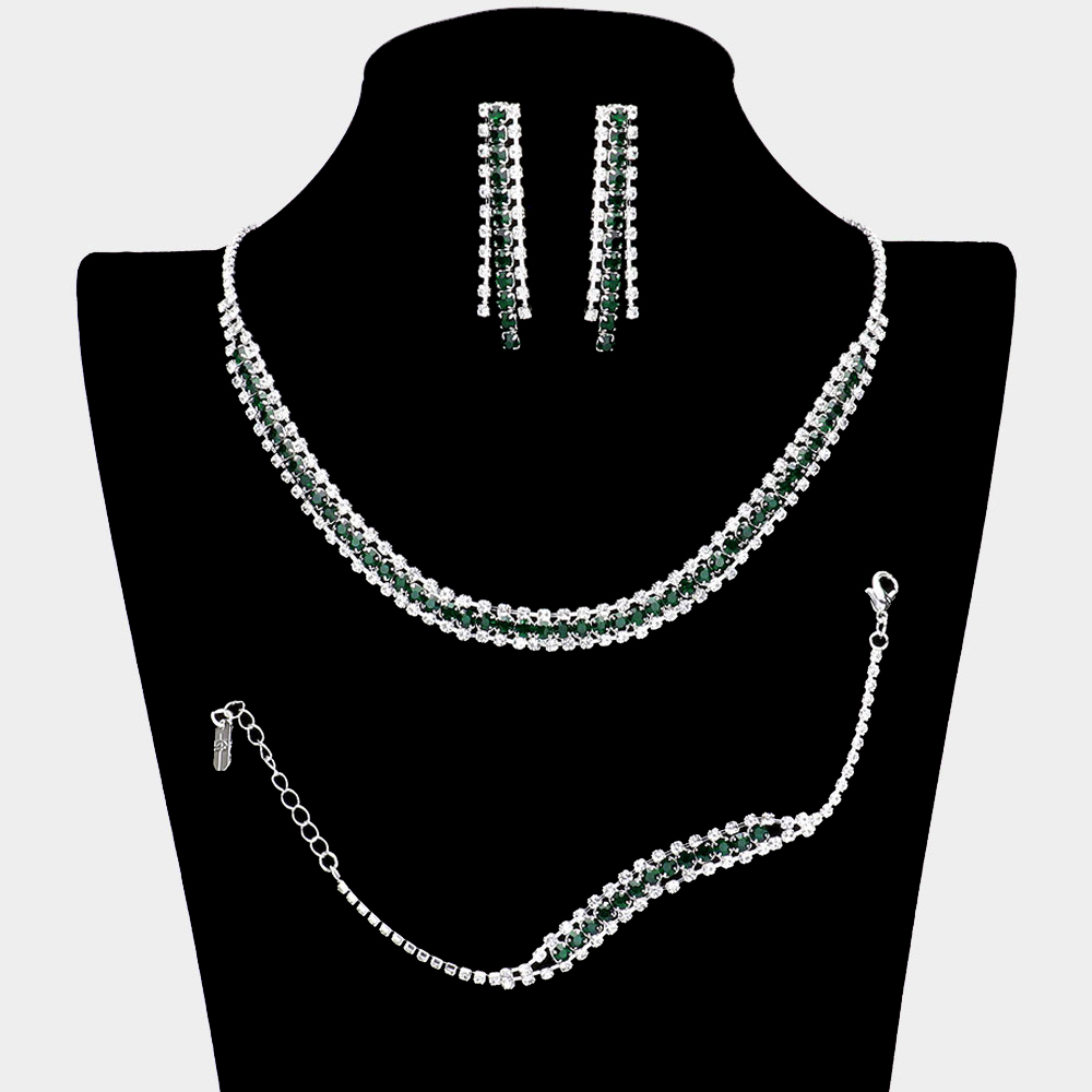 • Elevate your style with this elegant rhinestone jewelry set, featuring a sparkling necklace, matching bracelet, and drop earrings. Perfect for weddings, parties, or evening occasions, this coordinated trio adds timeless radiance and refined sophistication to any ensemble.