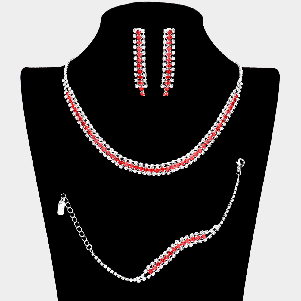 • Elevate your style with this elegant rhinestone jewelry set, featuring a sparkling necklace, matching bracelet, and drop earrings. Perfect for weddings, parties, or evening occasions, this coordinated trio adds timeless radiance and refined sophistication to any ensemble.