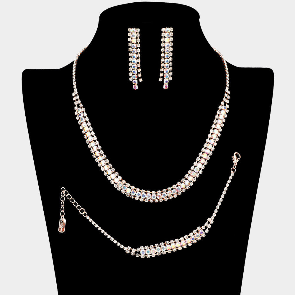 Details • Necklace Size : 16" + 4" L • Decor Size : 0.3" L • Bracelet Size : 0.3" H, 7" + 2" L • Earrings Size : 1.9" L • Elevate your style with this elegant rhinestone jewelry set, featuring a sparkling necklace, matching bracelet, and drop earrings. Perfect for weddings, parties, or evening occasions, this coordinated trio adds timeless radiance and refined sophistication to any ensemble.