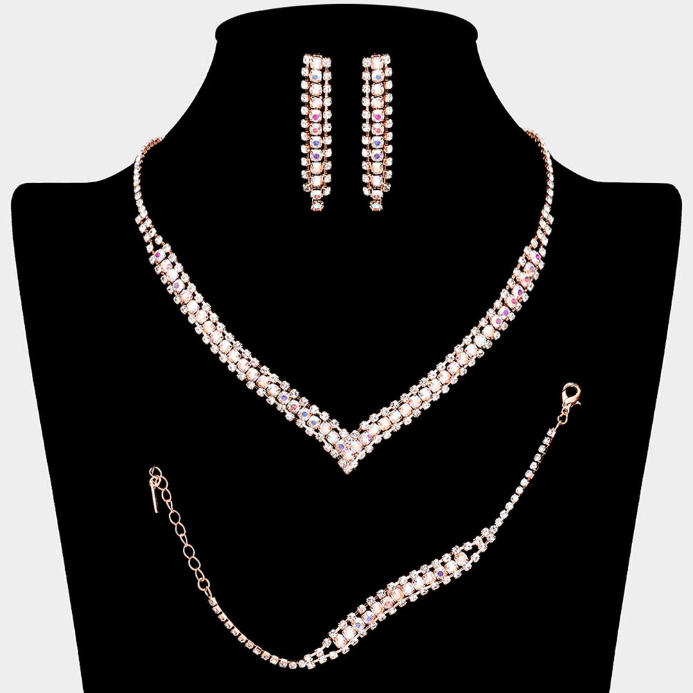 • Elevate any special occasion with this refined jewelry set featuring a matching necklace, bracelet, and earrings. Its sparkling rhinestone arrangement creates a cohesive, eye-catching look designed to enhance formal outfits with timeless sophistication and graceful shine.