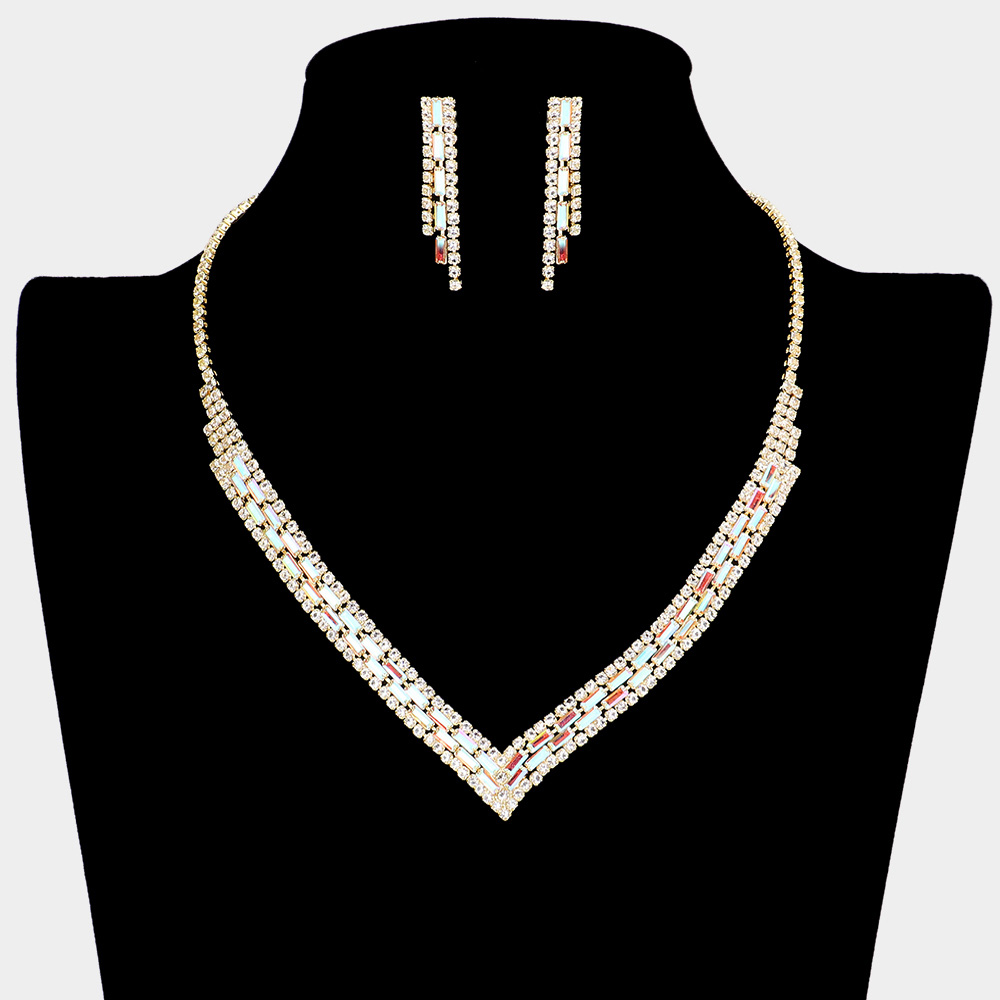 Details • Necklace Size : 16" + 4" L • Decor Size : 0.5" L • Earring Size : 1.5" L • Stylish V-shaped necklace and matching earrings adorned with shimmering stones and elegant detailing. Perfect for formal events, weddings, or evening occasions, this sophisticated jewelry set brings a radiant sparkle and refined elegance to any outfit, enhancing your timeless charm.