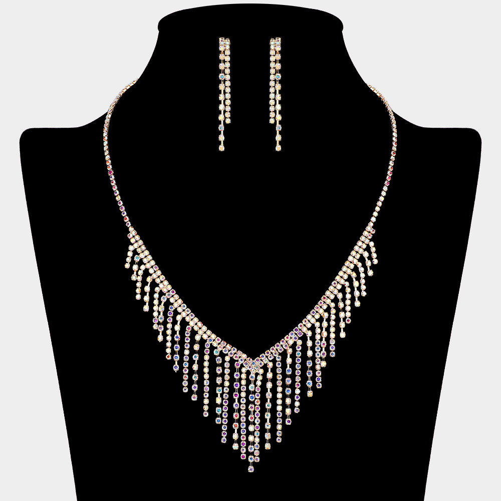 • Add a touch of dramatic elegance with this Cascading Fringe Crystal Necklace and Earring Set. Designed with layered strands of shimmering stones that flow beautifully, this statement set enhances evening gowns and formal attire with radiant sparkle and sophisticated allure for any special occasion.