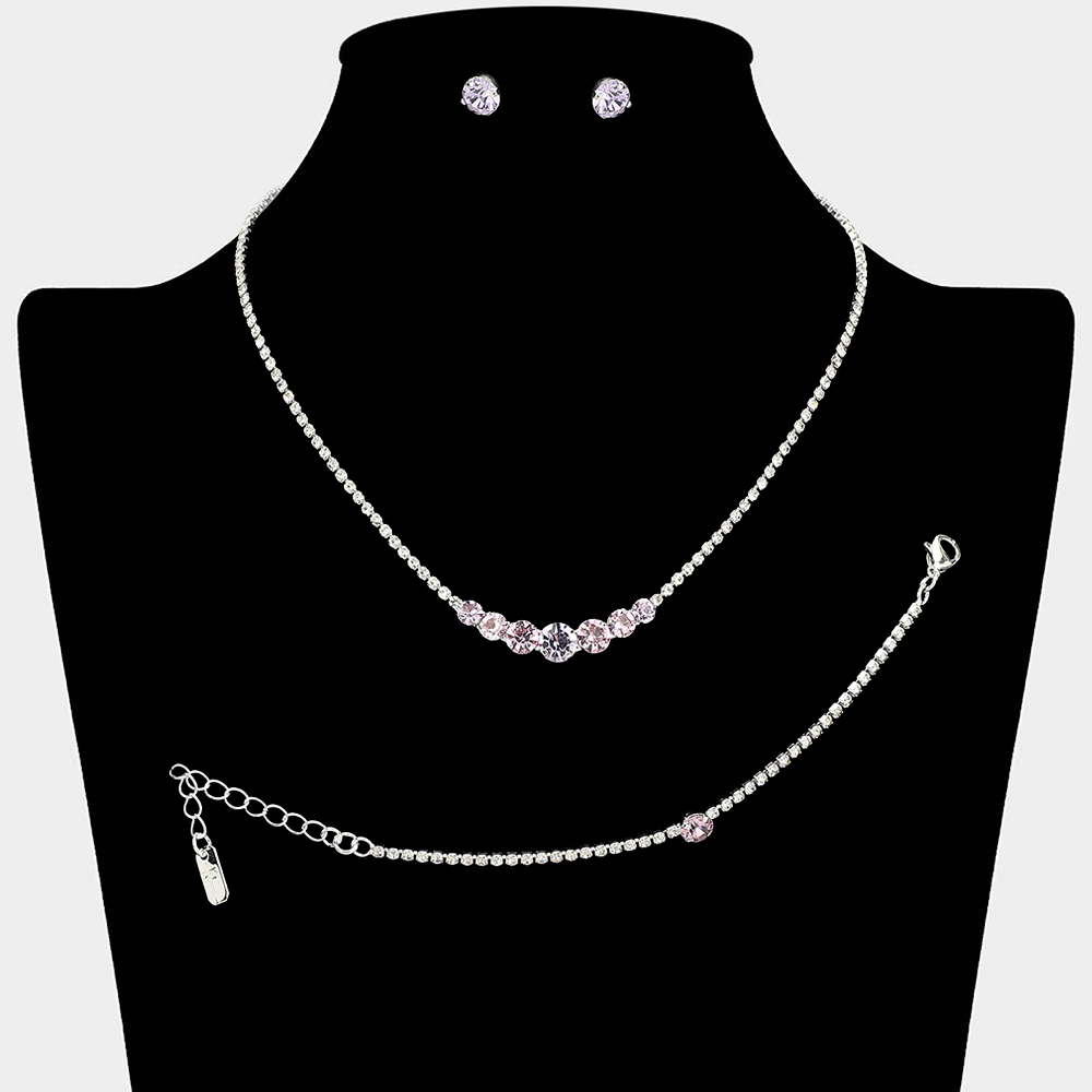 • Timeless matching necklace, stud earring, and bracelet set designed with a clean round stone centerpiece for effortless elegance. Ideal for weddings, formal events, parties, and everyday special occasion styling. A versatile set that delivers refined sparkle and coordinated sophistication.