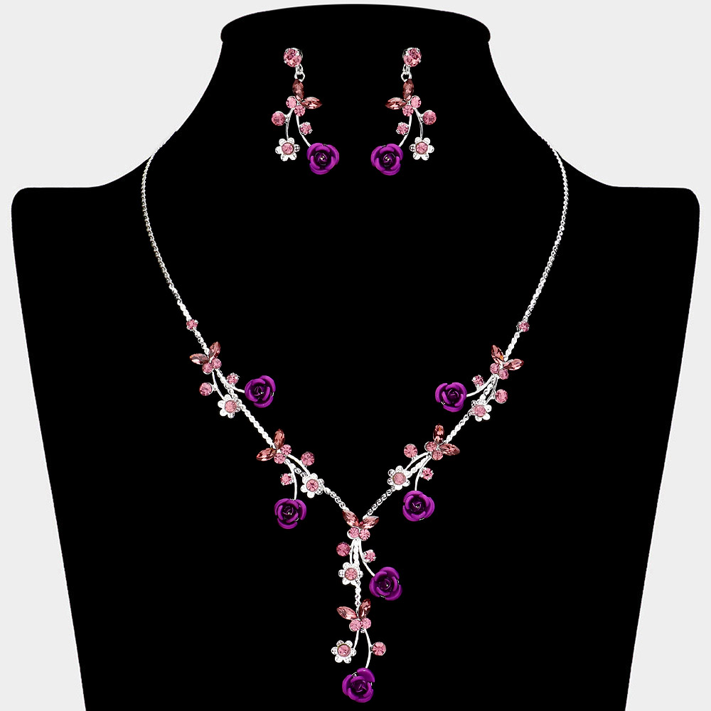Colored Rose Vine Butterfly Stone Cluster Rhinestone Paved Necklace
