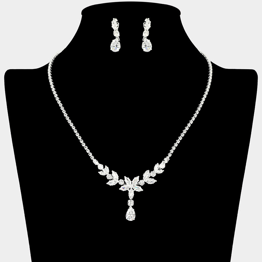• This elegant floral crystal jewelry set features a stunning necklace and matching earrings adorned with brilliant teardrop accents. Perfect for weddings, evening events, or formal occasions, the intricate floral design radiates timeless glamour and sophisticated brilliance in every detail.