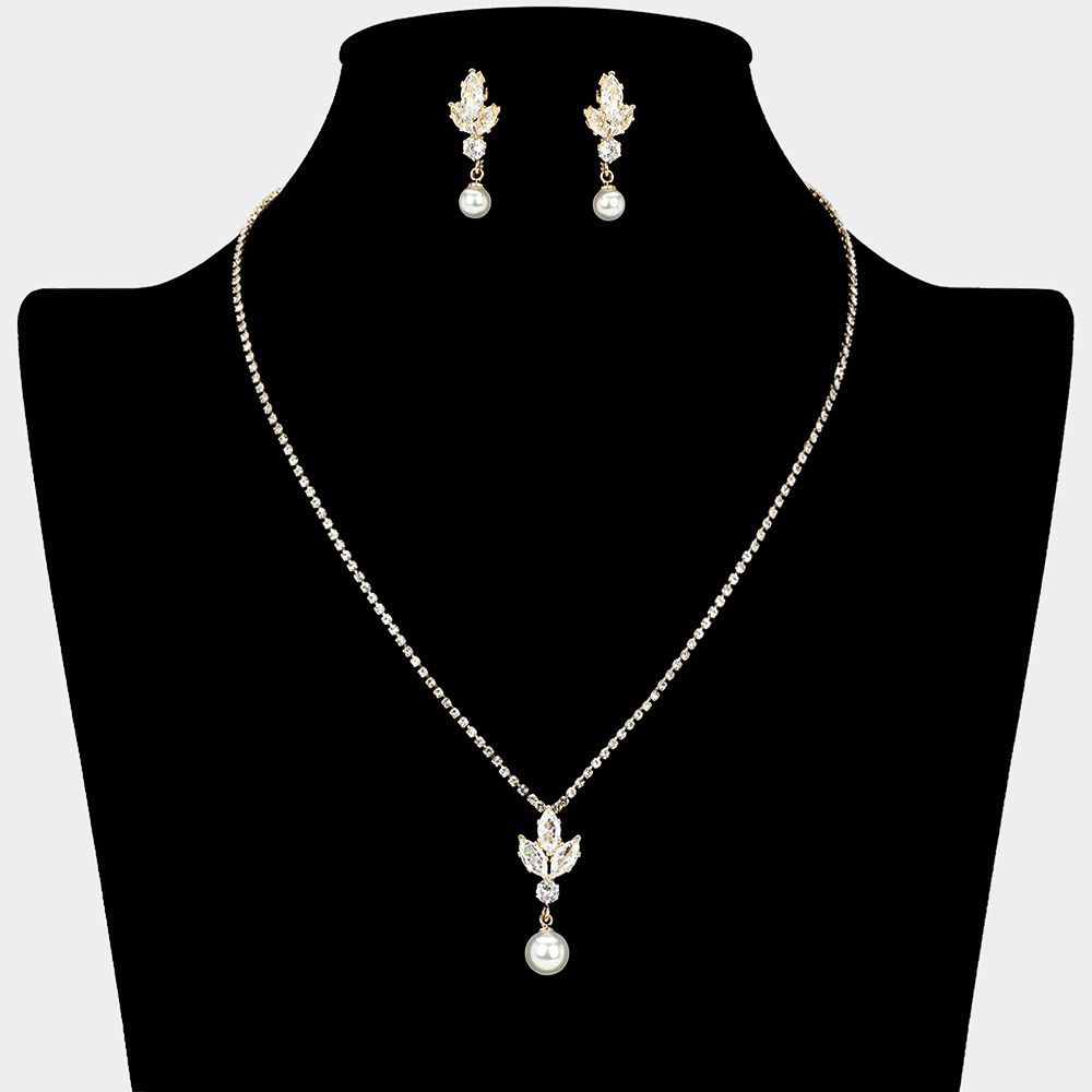 CZ Stone Paved Pearl Dangle Marquise Cluster Pendant Pointed Necklace