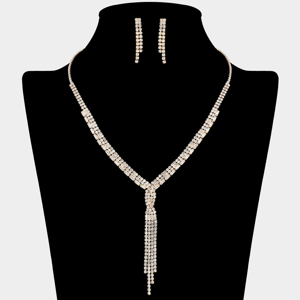 Details • Necklace Size : 17" + 4" L • Decor Size : 3.2" L • Earrings Size : 1.25" L • Stylish Y-drop necklace and earring set featuring a cz rhinestone tassel pendant and matching linear earrings. The sleek, cascading design adds a touch of glamour, perfect for evening wear, parties, and formal occasions. • CZ Cubic Zirconia • Lead and Nickel Compliant