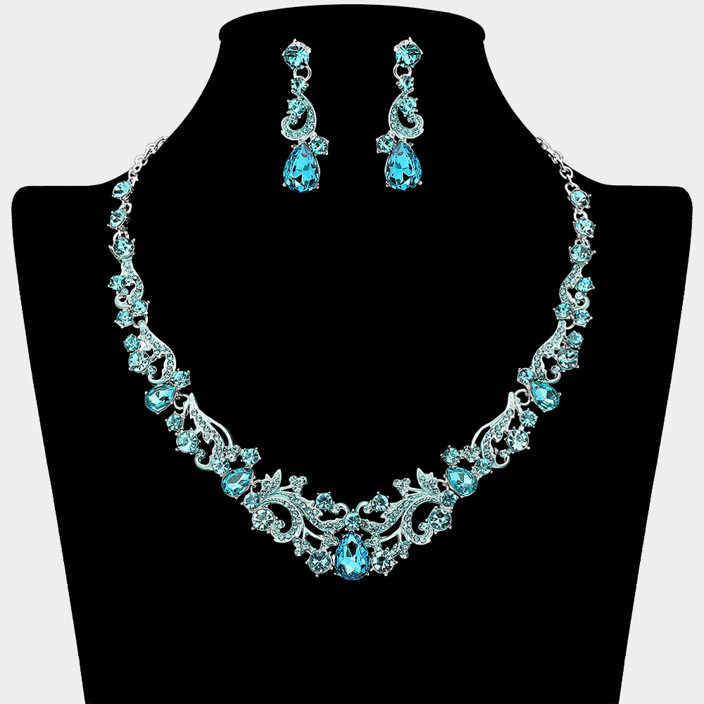 Details • Necklace Size : 18" + 3" L • Decor Size : 0.8" L • Earrings Size : 1.6" L • Stunning jewelry set featuring an ornate crystal necklace with teardrop accents and matching earrings. Perfect for weddings, proms, or formal occasions, adding sophistication and timeless sparkle to any outfit.