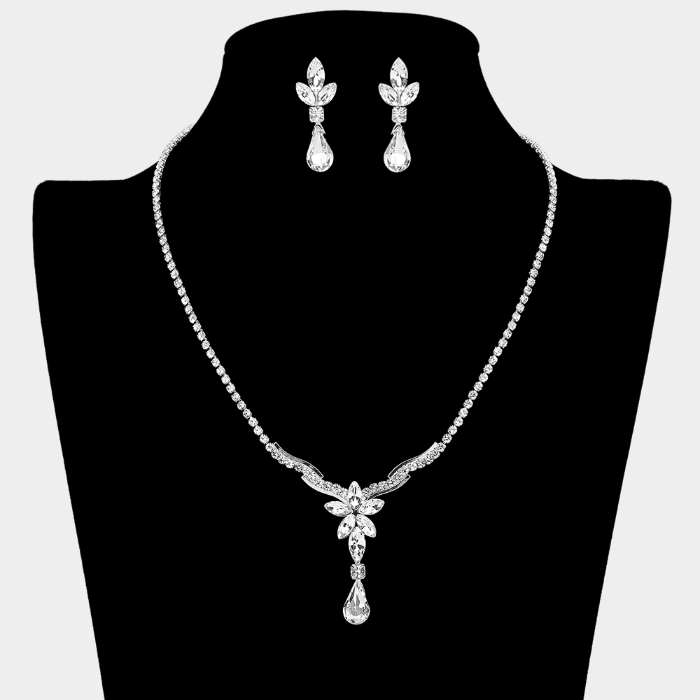 • Stunning jewelry set featuring a delicate rhinestone chain and a graceful floral-inspired pendant with a teardrop crystal drop. Includes matching dangle earrings. Perfect for bridal parties, prom, or formal occasions.