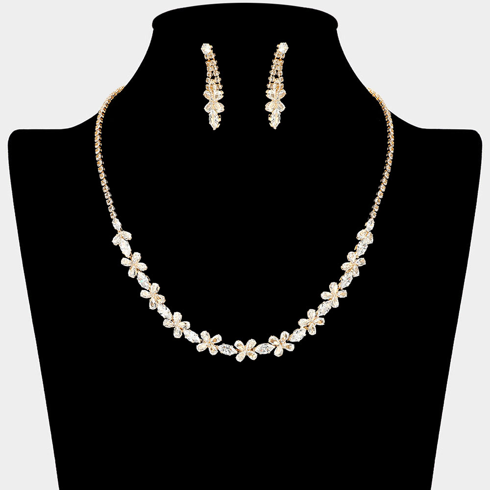 • Dainty crystal cz flower necklace and matching drop earring set with sparkling floral accents. A timeless jewelry set ideal for weddings, proms, parties, or adding a graceful touch to elegant evening looks.