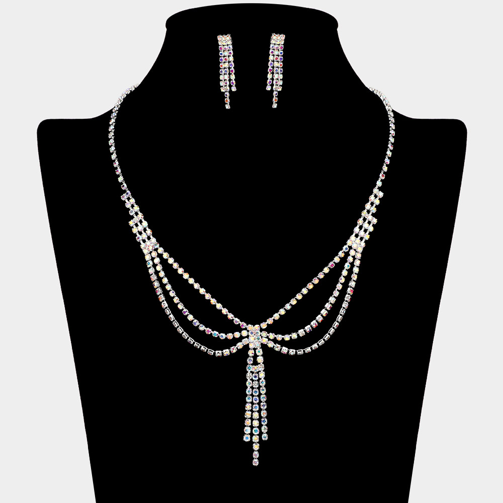 • Elegant layered necklace and earring set featuring cascading rhinestone strands and a center tassel accent. The draped silhouette adds graceful movement, perfect for formal events, evening wear, or stylish special occasions.