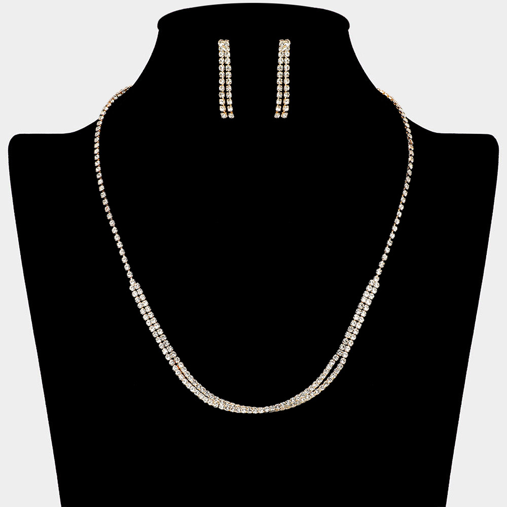 • Refined jewelry set featuring a sleek dual-strand rhinestone necklace paired with matching linear drop earrings. The necklace’s layered contour and minimalist symmetry create an elegant silhouette, perfect for formal events or evening attire.