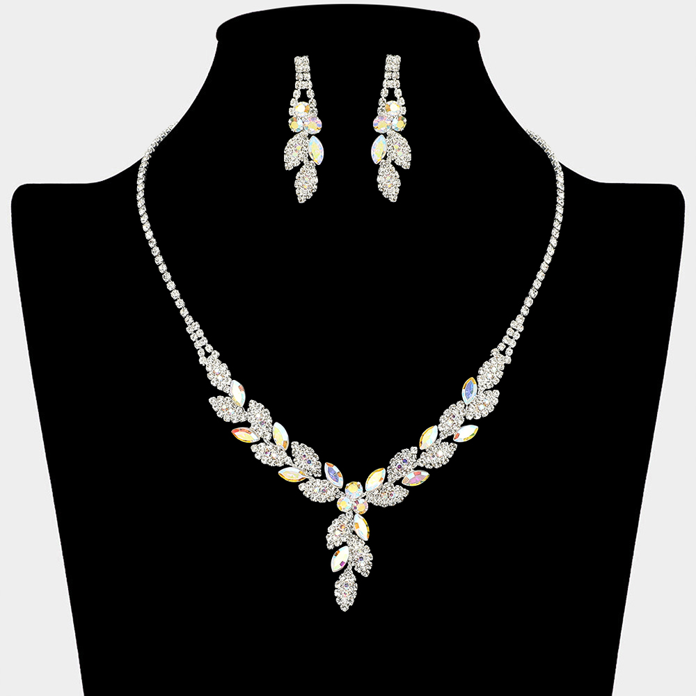 • This elegant necklace and earring set showcases a graceful leaf-inspired design with layered crystal accents and a refined drop silhouette. Perfect for weddings, formal events, proms, and special occasions, it delivers eye-catching sparkle and balanced elegance that enhances evening gowns, bridal looks, and statement outfits.