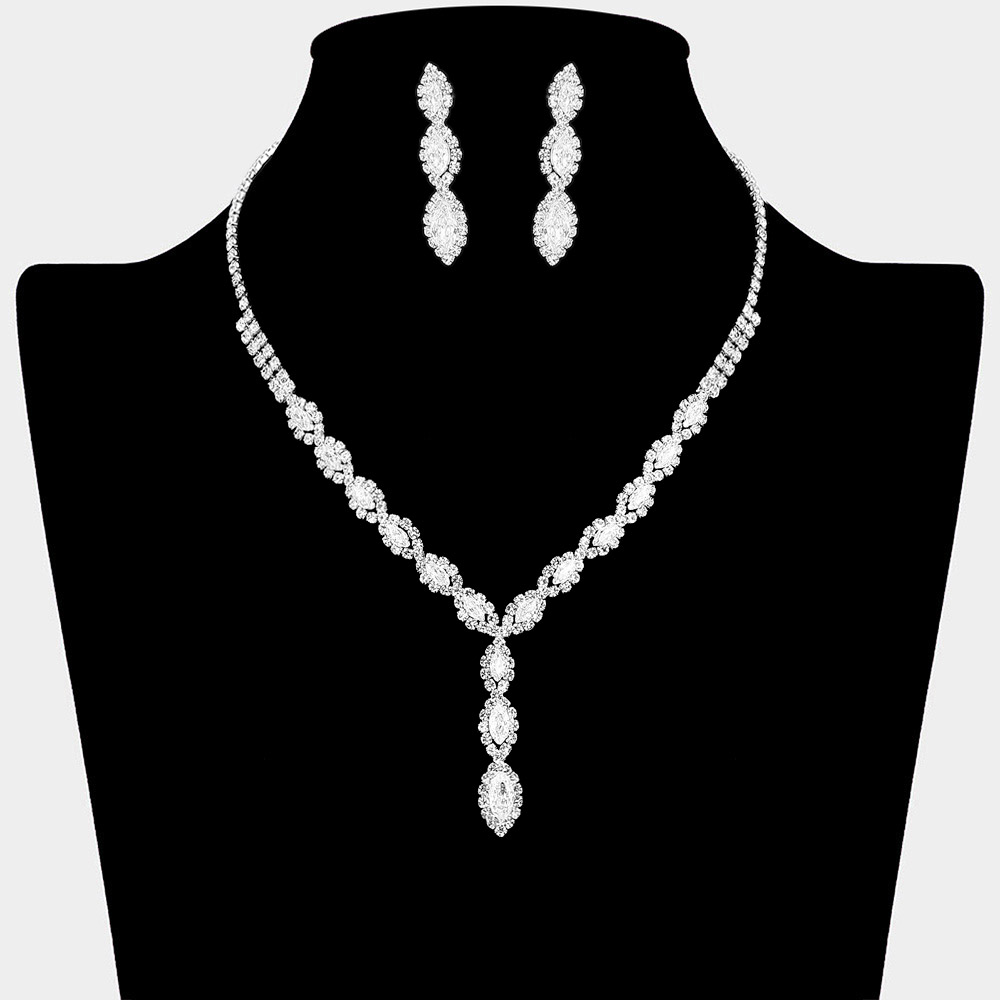 • Dazzling jewelry set featuring a V-shaped CZ stone necklace with marquise-cut clusters and matching drop earrings. Its symmetrical layout and elongated teardrop silhouette bring timeless elegance to evening, bridal, or formal looks.