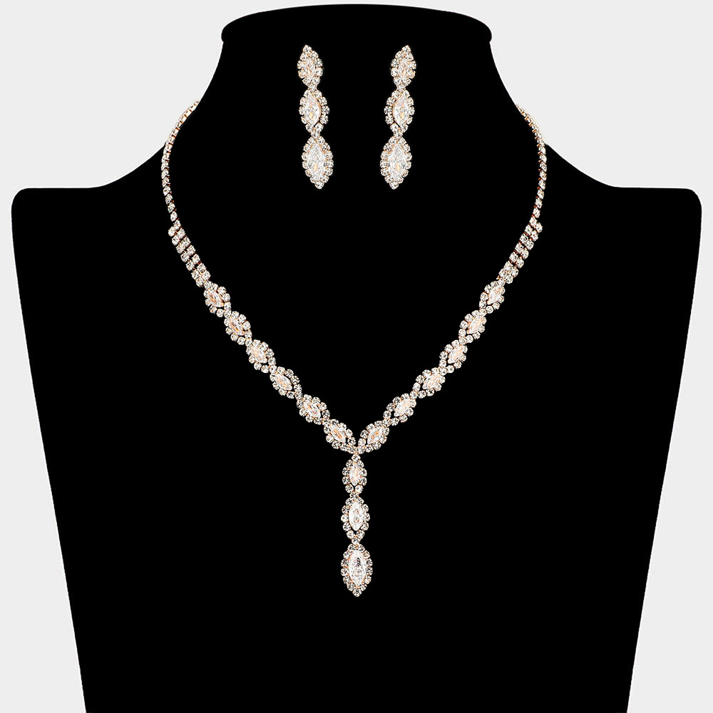 Details • Necklace Size : 14" + 5" L • Decor Size : 1.7" L • Earrings Size : 1.5" L • Dazzling jewelry set featuring a V-shaped CZ stone necklace with marquise-cut clusters and matching drop earrings. Its symmetrical layout and elongated teardrop silhouette bring timeless elegance to evening, bridal, or formal looks. • CZ Cubic Zirconia • Lead and Nickel Compliant
