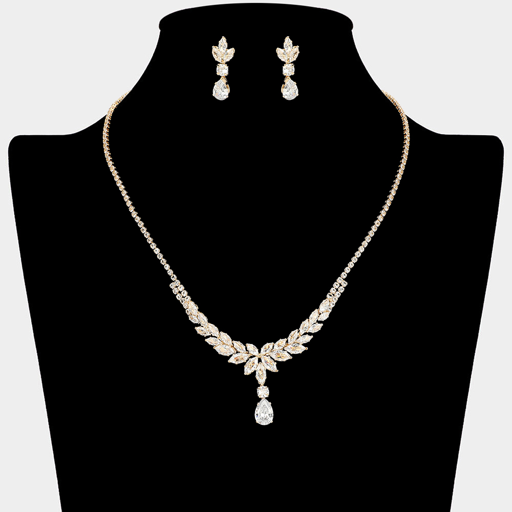 Details • Necklace Size : 16" + 4.5" L • Decor Size : 1.25" L • Earrings Size : 1" L • This elegant necklace and earring set features a refined leaf-inspired design with marquise and teardrop crystal accents that create graceful sparkle and movement. Ideal for bridal wear, formal events, and evening occasions, this statement set adds timeless sophistication and a polished finish to dresses and gowns. • CZ Cubic Zirconia