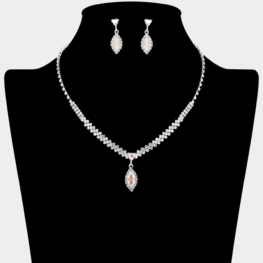• Elegant jewelry set featuring a crystal teardrop pendant necklace with matching earrings. The sparkling rhinestone accents and refined setting create a timeless look, perfect for weddings, evening events, or adding sophistication to any formal outfit.