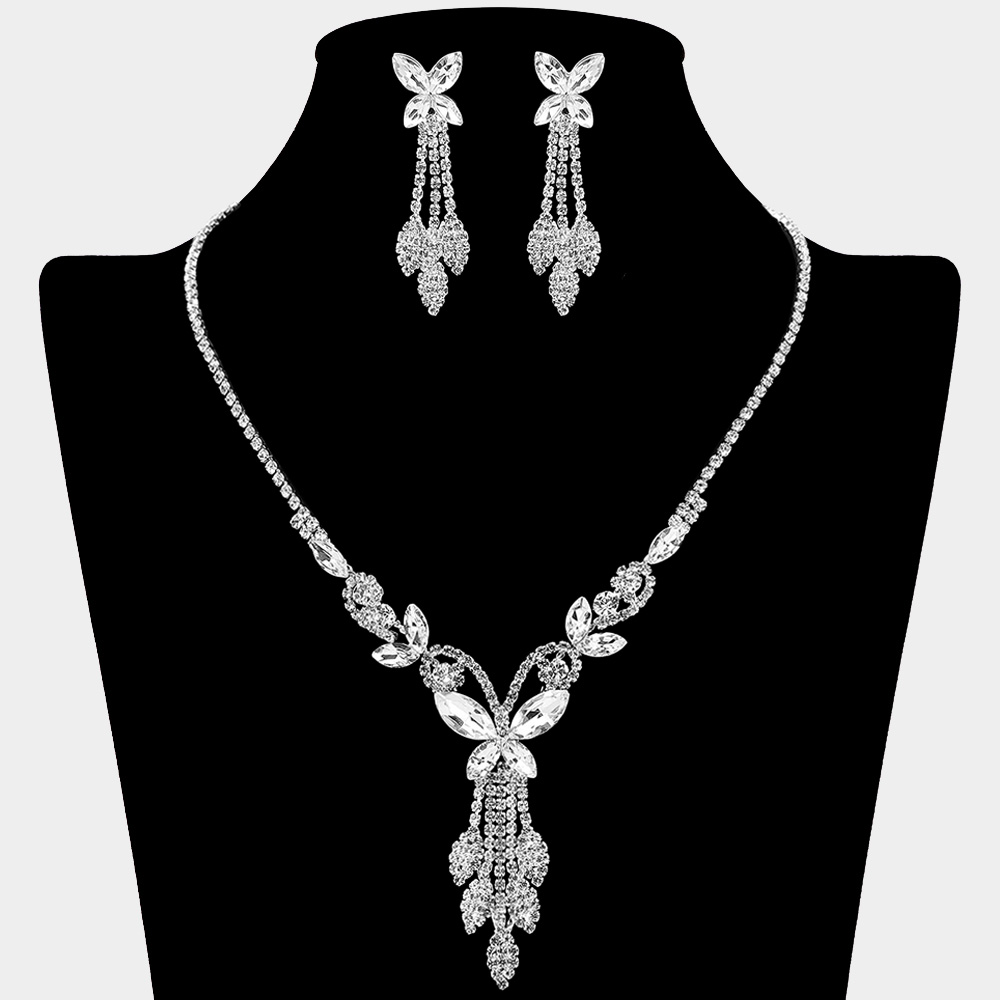 Details • Necklace Size : 18" + 4.75" L • Decor Size : 3" L • Earrings Size : 2.1" L • Add charm and elegance with this butterfly drop necklace and earring set. Featuring sparkling stones and a refined design, it's perfect for weddings, evening events, and formal occasions, making it a timeless addition to any jewelry collection.