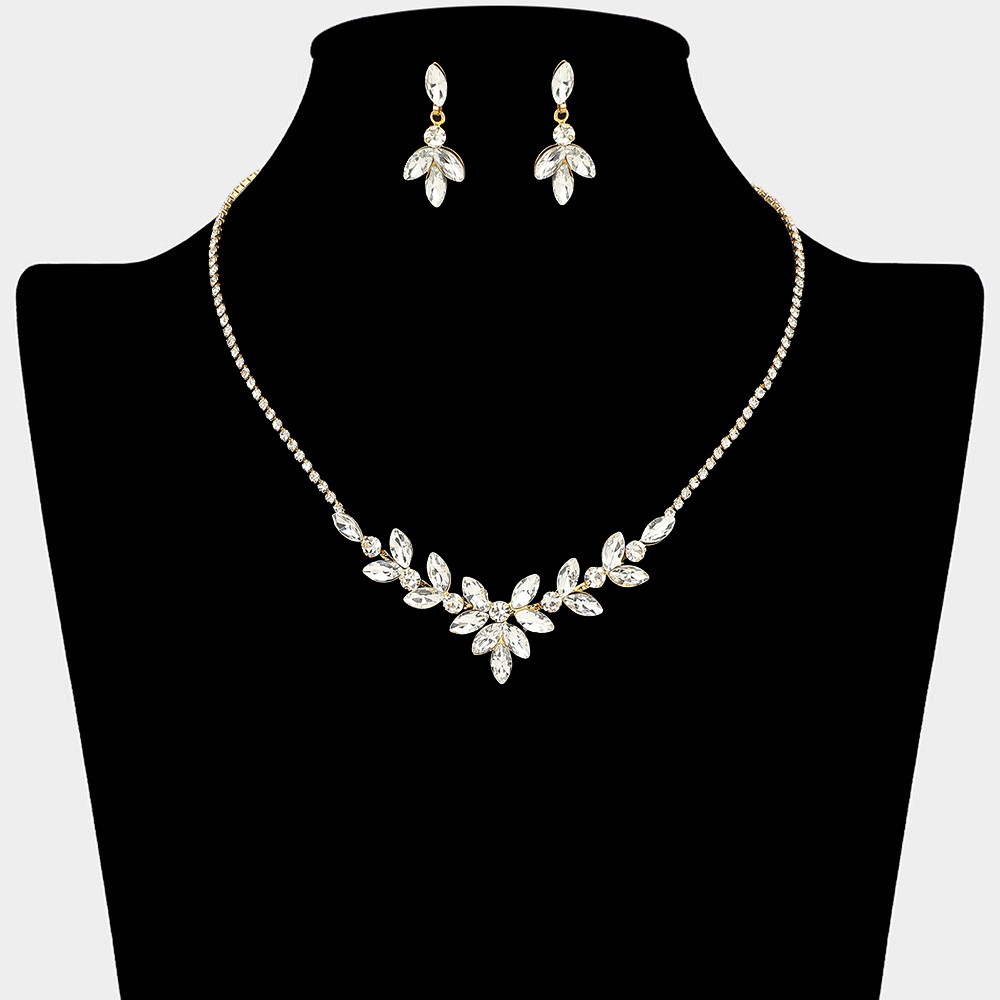 • This refined necklace and matching earring set features a leaf-inspired crystal arrangement that frames the neckline with elegant sparkle. Designed for weddings, bridal parties, formal events, and evening wear, it offers a graceful statement look that enhances dresses, gowns, and special occasion styling with timeless appeal.
