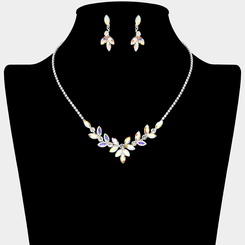 Details • Necklace Size : 15" + 4" L • Decor Size : 0.8" L • Earrings Size : 1.2" L • This refined necklace and matching earring set features a leaf-inspired crystal arrangement that frames the neckline with elegant sparkle. Designed for weddings, bridal parties, formal events, and evening wear, it offers a graceful statement look that enhances dresses, gowns, and special occasion styling with timeless appeal.