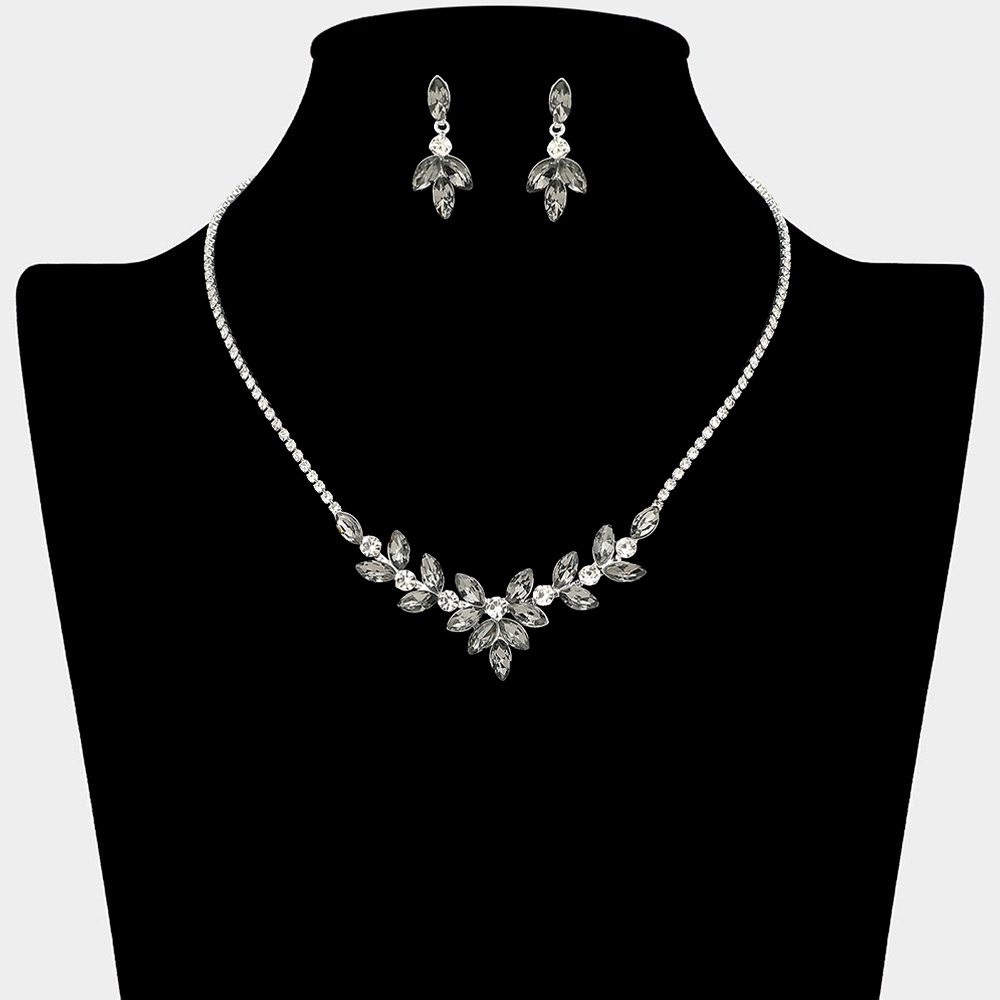 • This refined necklace and matching earring set features a leaf-inspired crystal arrangement that frames the neckline with elegant sparkle. Designed for weddings, bridal parties, formal events, and evening wear, it offers a graceful statement look that enhances dresses, gowns, and special occasion styling with timeless appeal.
