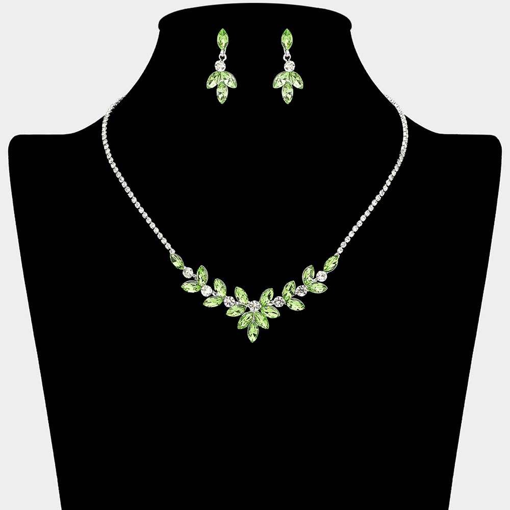Details • Necklace Size : 15" + 4" L • Decor Size : 0.8" L • Earrings Size : 1.2" L • This refined necklace and matching earring set features a leaf-inspired crystal arrangement that frames the neckline with elegant sparkle. Designed for weddings, bridal parties, formal events, and evening wear, it offers a graceful statement look that enhances dresses, gowns, and special occasion styling with timeless appeal.