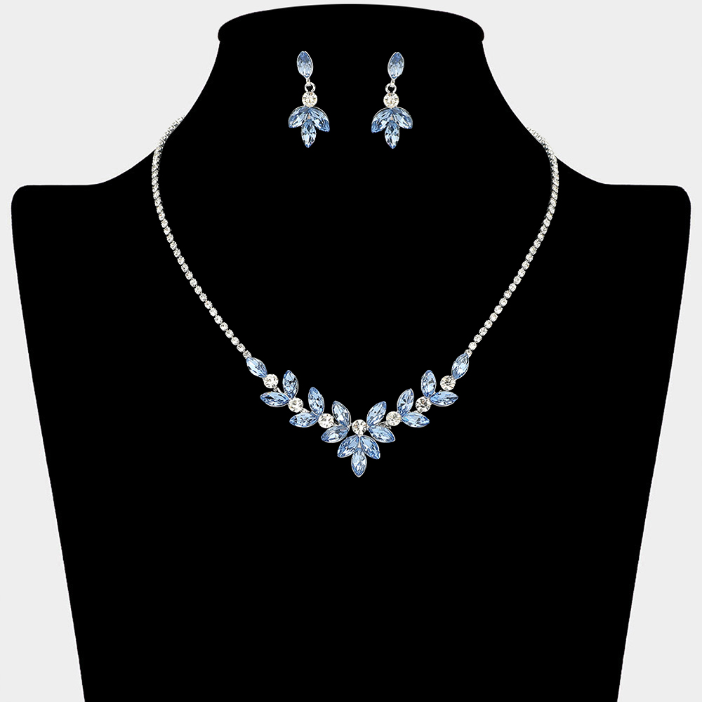 • This refined necklace and matching earring set features a leaf-inspired crystal arrangement that frames the neckline with elegant sparkle. Designed for weddings, bridal parties, formal events, and evening wear, it offers a graceful statement look that enhances dresses, gowns, and special occasion styling with timeless appeal.