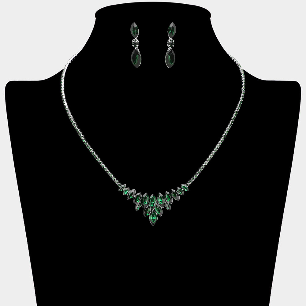• Elegant marquise cut rhinestone statement set featuring a dramatic V-shaped drop necklace constructed from cascading stones and a delicate line chain. The sophisticated necklace pairs perfectly with the included dangle earrings. Ideal accessories for brides, proms, galas, and formal events. This stunning set makes a bold and dazzling style statement.