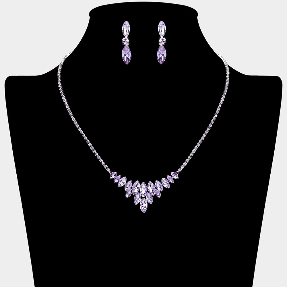 • Elegant marquise cut rhinestone statement set featuring a dramatic V-shaped drop necklace constructed from cascading stones and a delicate line chain. The sophisticated necklace pairs perfectly with the included dangle earrings. Ideal accessories for brides, proms, galas, and formal events. This stunning set makes a bold and dazzling style statement.