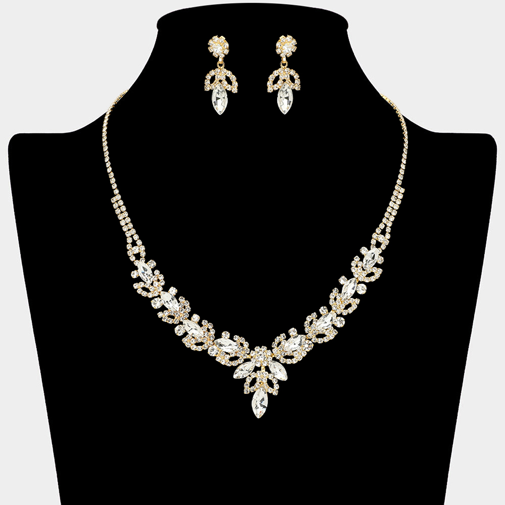 • This statement necklace and matching earring set showcases cascading leaf and drop details in a symmetrical design that frames the neckline beautifully. Ideal for weddings, formal events, evening wear, and special occasions, it delivers refined sparkle and a polished finish to elevated looks.