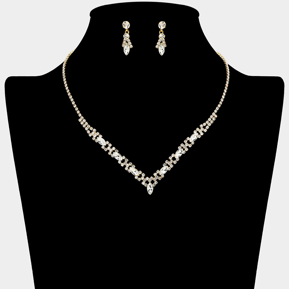 • Refined necklace and earring set designed with a sleek V-shaped silhouette and coordinated accents for a polished look. Perfect for weddings, formal events, parties, and evening wear. A timeless set that enhances special occasion styling with subtle elegance and sophistication.