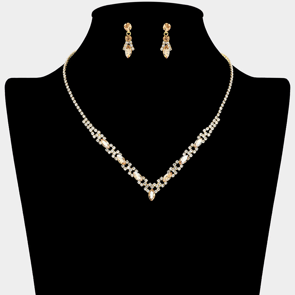 • Refined necklace and earring set designed with a sleek V-shaped silhouette and coordinated accents for a polished look. Perfect for weddings, formal events, parties, and evening wear. A timeless set that enhances special occasion styling with subtle elegance and sophistication.