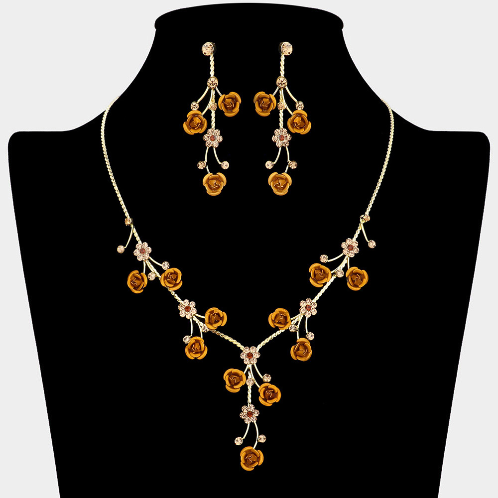 • Elevate your look with this elegant floral necklace and earring set. Featuring delicate flower accents and a graceful design, this jewelry set adds a refined charm to both special occasions and everyday wear, making it a must-have accessory for timeless sophistication.