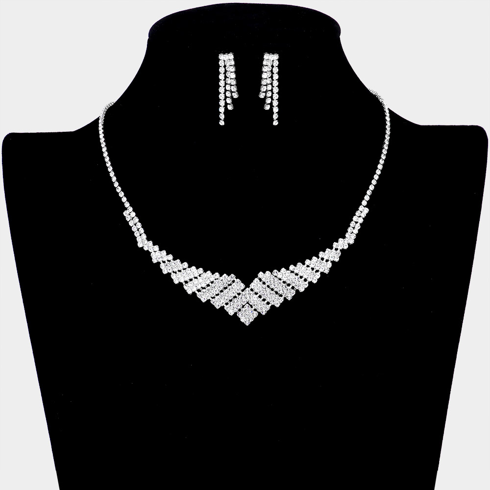 • Dazzle at weddings, parties, or proms with this rhinestone chevron necklace and matching earrings set. The layered geometric design brings brilliance and refinement, making it the perfect accessory for formal events, evening looks, and any celebration that calls for timeless sparkle.