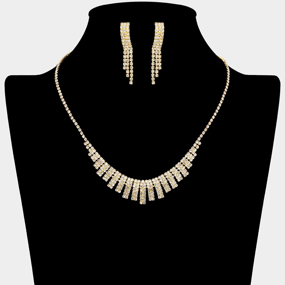 • Add modern sophistication to your look with this radiant bar necklace and earring set. Featuring sleek cascading rows of sparkling stones, this set brings a refined brilliance to any outfit. Perfect for formal occasions, parties, or elegant evenings out.
