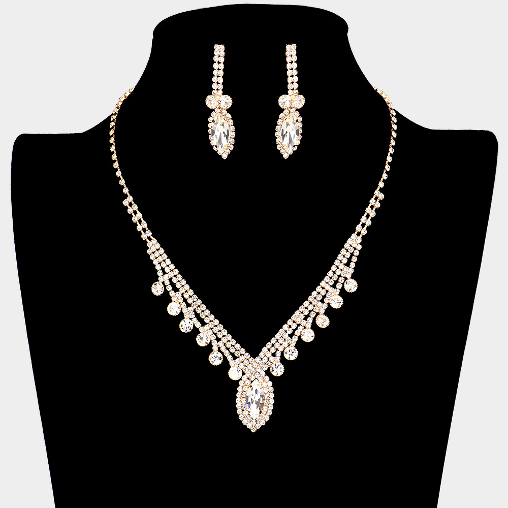 • Elegant teardrop crystal necklace and earring set designed for formal occasions. Features sparkling stones and a delicate drop pattern for a timeless look. Perfect for weddings, proms, and evening events, adding a refined touch of glamour and sophistication to any outfit.