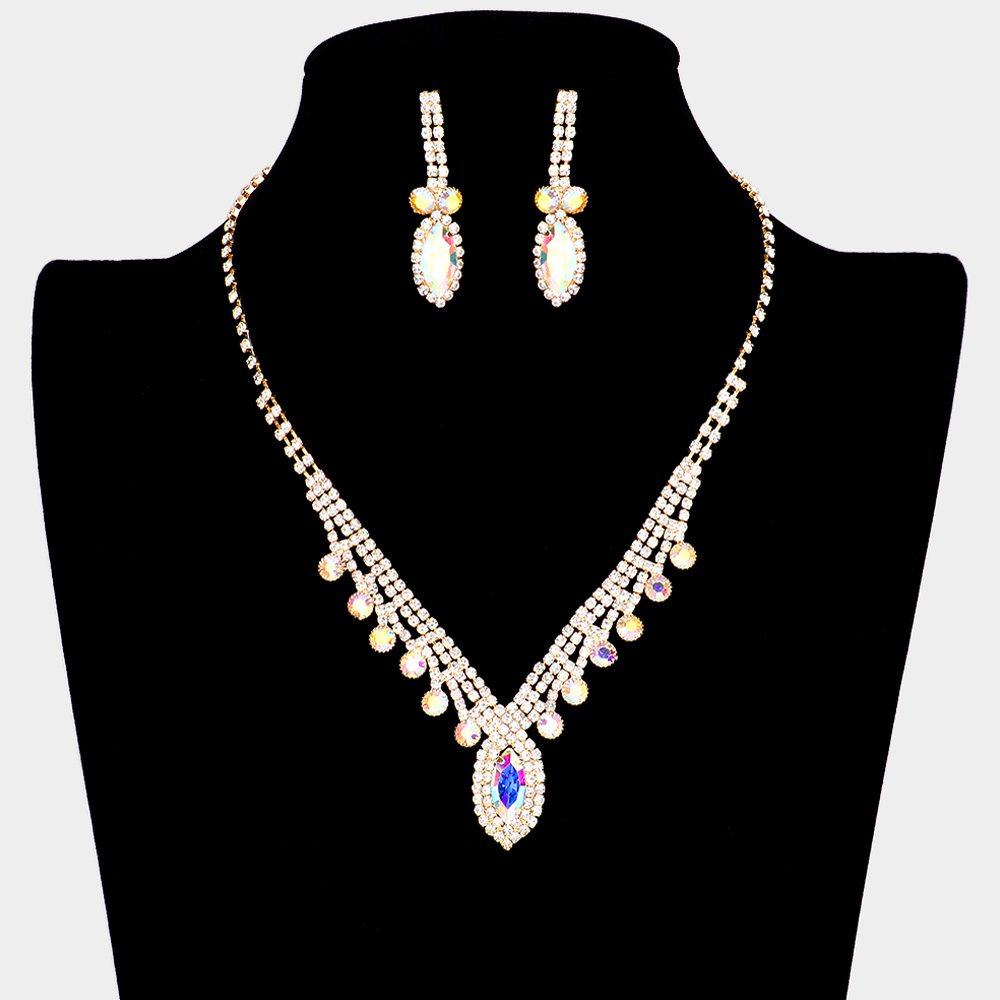 Details • Necklace Size : 16" + 4.5" L • Decor Size : 1" L • Earring Size : 1.75" L • Elegant teardrop crystal necklace and earring set designed for formal occasions. Features sparkling stones and a delicate drop pattern for a timeless look. Perfect for weddings, proms, and evening events, adding a refined touch of glamour and sophistication to any outfit. • Lead and Nickel Compliant