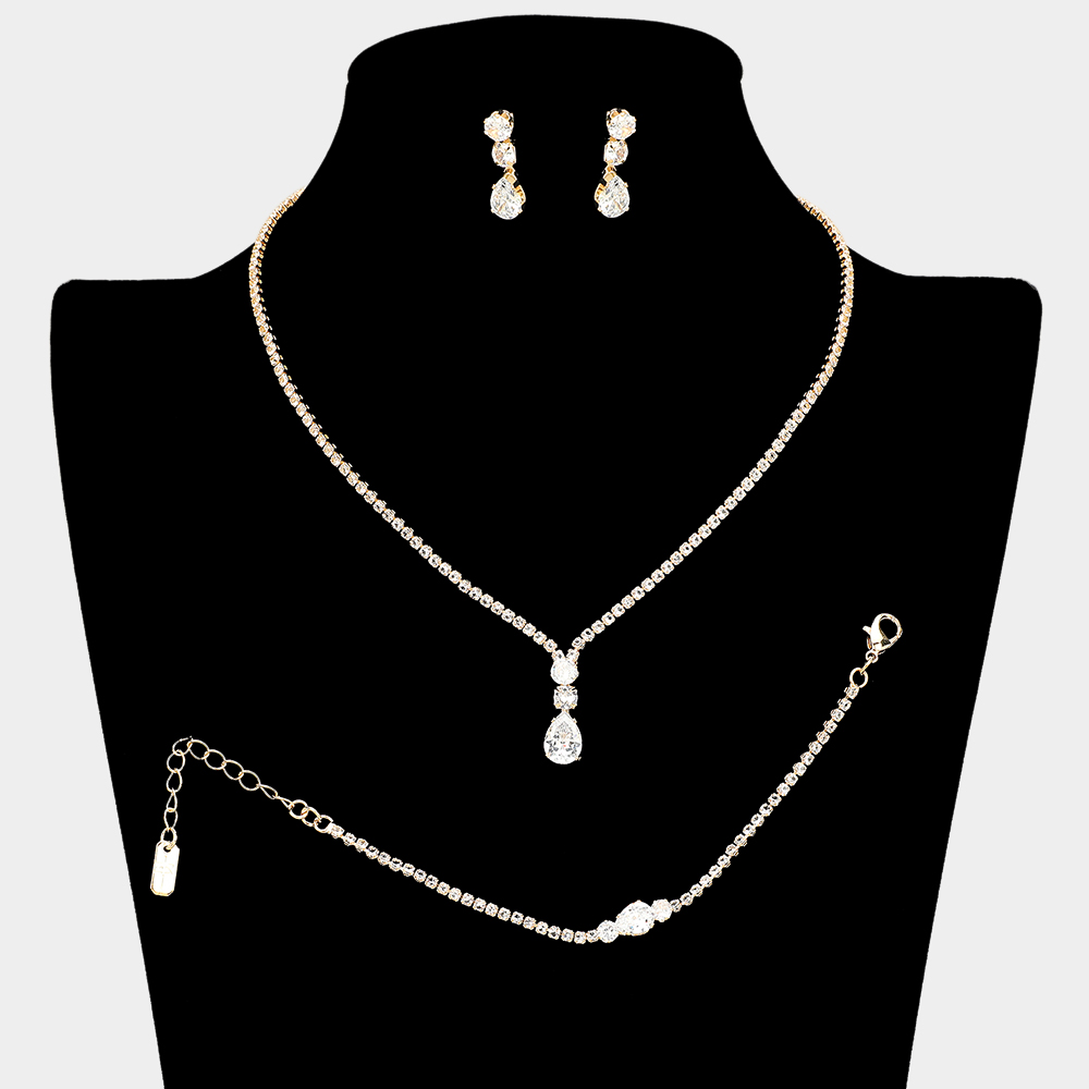 Details • Necklace Size : 14.25" + 4" L • Decor Size : 0.8" L • Bracelet Size : 0.25" H, 5.5" + 2" L • Earrings Size : 0.8" L • This elegant bridal jewelry set includes a teardrop pendant necklace, matching earrings, and a delicate bracelet. Designed to elevate wedding attire and formal looks, it brings refined sparkle and timeless charm, making it an ideal choice for brides, bridesmaids, and special celebrations. • CZ Cubic Zirconia • Lead and Nickel Compliant